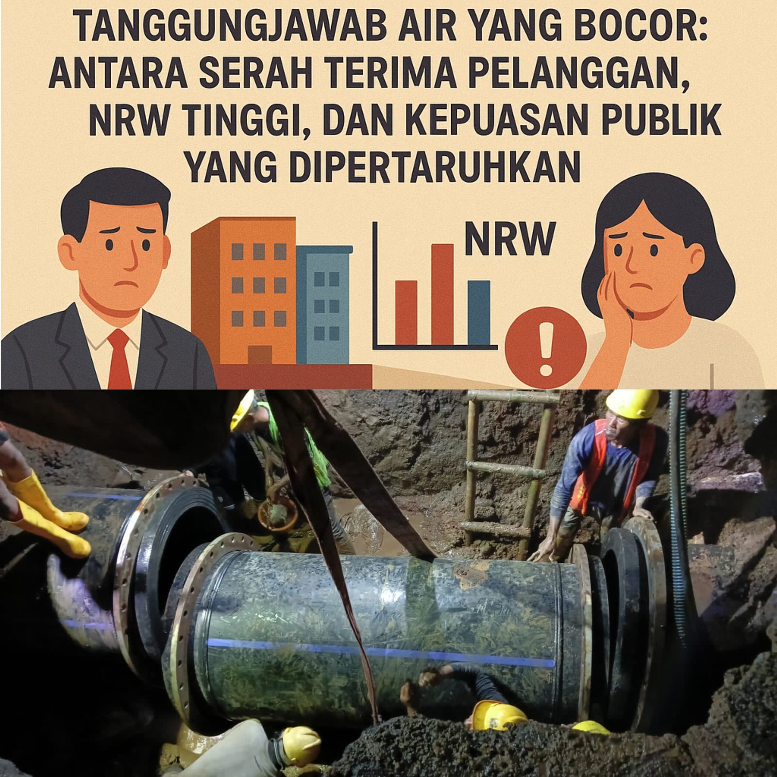 Namun sayangnya, alih kelola yang seharusnya membawa perbaikan justru memunculkan berbagai persoalan teknis di lapangan, termasuk kebocoran pipa, gangguan suplai air, serta tingginya angka Non-Revenue Water (NRW). Serah terima ini menyisakan pertanyaan besar: siapa yang bertanggung jawab ketika air tidak mengalir dan kepercayaan publik merosot?